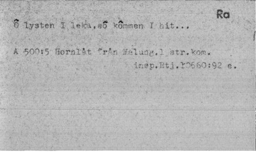 //// ~ Ra //// O lysten I, le ka, so kommeri'. T hit... //// A 500; 5; Hornlåt ^rån Sal ung, 1.. str.kom. //// Wp.Titj.>0660:92 e. ////