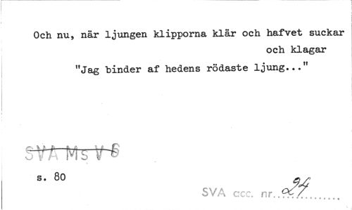 //// Och nu, när ljungen klipporna klär och hafvet suckar //// och klagar "Jag binder af hedens rödaste ljung..." //// m ms v g //// SVA ccc. nr.. ////