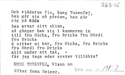 //// Och riddaren fin, kung Tusenfej, han går sig på gården, han går* sig på Råda //// han artar sitt skinn, så gångar han sig i kammaren in till fru Hicka, fru Bricka fru Dördi fru Dricka //// å sitter ni här, fru Hicka, fru Bricka //// fru Dördi fru Dricka //// allt under ett tak, //// får jag taga eder syster tilläkta? //// 'KUNG TUSENFEjJ», Visan om 7 //// Efter Emma Helmer. rML. ////