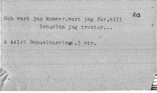 //// Ra //// Och vart jag kommer,vart jag far,till Böh aslän jag t rakt ar... //// X 441:5 Bohusläns*/! s§p str. //// / ////