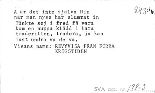 //// Å är det inte själva Min när man nyss har slumrat in Tänkte sej i fred få vara kom en nuppa klädd i bara traderitten, tradera, ja kan just undra va de va. //// Visans namn: REVYVISA FRÄN FÖRRA KRIGSTIDEN //// SVA ccc. nr //// ./Kal... ////