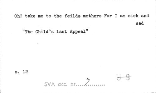//// Oh! take me to the feilds mothers For I am sick and //// sad //// "The Child's last Appeal" s. 12 //// 9 .-ii SVA ccc. nr.../... ////