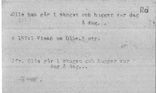 //// jB i ' * " ' ' ¦ " ' - //// 1 Ra //// .Olle han pAr i skogen och hugger v nr dag ; å dag... //// i ' • A 157:1 Visar om Olle3+r. //// Jfr, Olle »år i skogei och huggsr var l-ag r dag*.. //// i. " ////