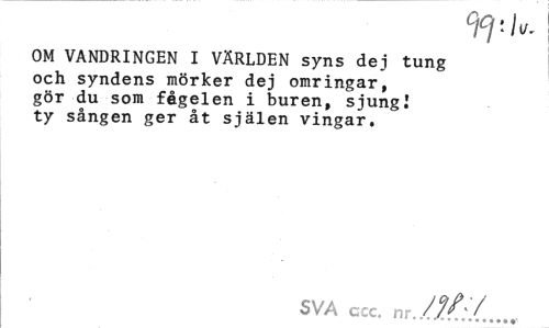 //// OM VANDRINGEN I VÄRLDEN syns dej tung och syndens mörker dej omringar, gör du som fégelen i buren, sjung I ty sången ger åt själen vingar. //// SVA //// ccc. nr. //A/ ////