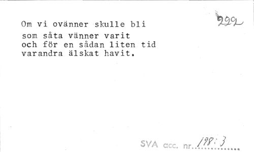 //// Om vi ovänner skulle bli //// som såta vänner varit och för en sådan liten tid varandra älskat havit. //// SVA acc. nr.//^' J. ////