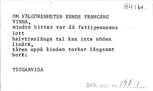 //// ; U //// OM VÄLGÖRENHETEN KUNDE FRAMGÅNG VINNA, //// mindre bitter var då fattigmannens lott //// halvtimslånga tal kan inte nöden lindra, //// tåren uppå kinden torkar långsamt borti //// TIGGARVISA //// SVA ccc. nr./f/:./... ////