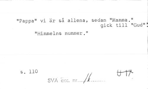 //// "Pappa" vi är så allena, sedan "Mamma." //// gick till "Gud" //// "Himmelns nummer." //// s-110 // tnt //// SVA ccc. nr.../i... ////