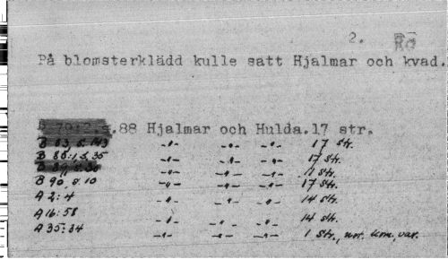 //// 1 n* //// I På blomsterklädd kulle satt Hjalmar och kvad //// ^JtKtjfr * H^almar Hulda. 17 str. //// ^^^^ -l- Z*- lf jfc. ////