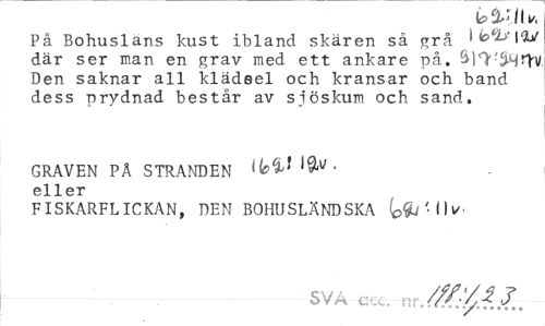 //// b milis. //// På Bohuslans kust ibland skären så grå där ser man en grav med ett ankare på. Den saknar all klädsel och kransar och band dess prydnad består av siöskum och sand. //// GRAVEN PÄ STRANDEN ' //// eller //// FISKARFLICKAN, DEN BOHUSLÄNDSKA //// SVA ccc. nr, ////i,/ ////