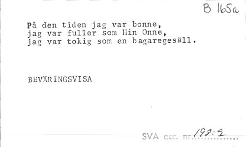 //// b IfeSa, //// På den tiden jag var bonne, //// jag var fuller som Hin Onne, //// jag var tokig som en bagaregesäll. //// BEVÄRINGSVISA //// SVA ccc. ////