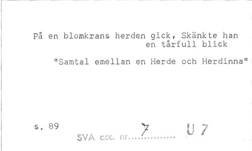 //// På en blomkrans herden gick, Skänkte han //// en tårfull blick //// "Samtal emellan en Herde och Herdinna" //// s. 89 V n 7 //// SVA ccc. nr.../...v 1 ////