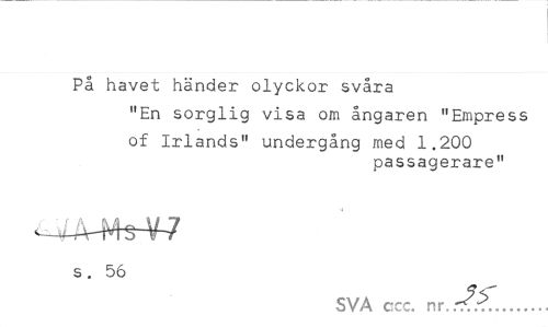//// På havet händer olyckor svåra //// "En sorglig visa om ångaren "Empress //// of Irlands" undergång med 1.200 //// passagerare" //// —Ä-MS-V7 //// s. 56 //// SVA ccc. nr. .fr. .V... ////