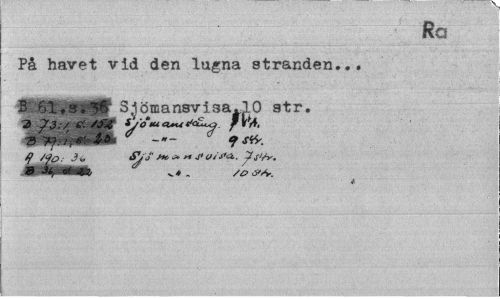 //// Ra //// På havet vid den lugna stranden... //// B Slts;^f Slömansvisa.10 str. //// 2 yj. / e< Sfl f VA. //// v-?f03Bmt a -»- d <fsv>>. //// {/ /fp: //// 3 H, e! $3, c . //// * ////