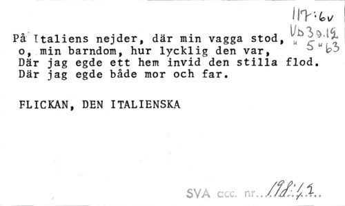 //// På Italiens nejder, där min vagga stod, o, min barndom, hur lycklig den var, ^ " b3 Där jag egde ett hem invid den stilla flod. Där jag egde både mor och far. //// FLICKAN, DEN ITALIENSKA //// SVA ccc. nr. .fr. .V. ////