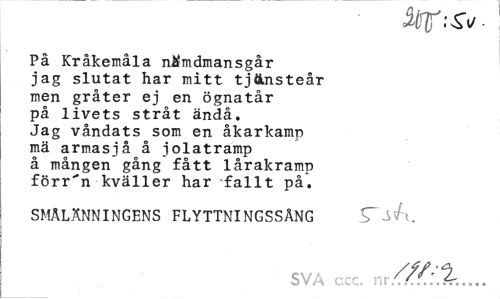 //// På Kråkemåla nÄmdmansgår jag slutat har mitt tjänsteår men gråter ej en ögnatår på livets stråt ändå. Jag våndats som en åkarkamp mä armasjå å jolatramp å mången gång fått lårakramp förr"n kväller har fällt på. //// SMÅLÄNNINGENS FLYTTNINGSSANG //// SVA ccc, nx ////