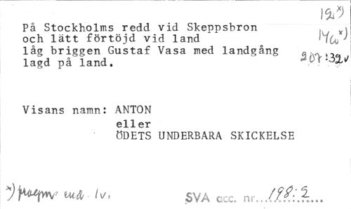 //// )%*) //// På Stockholms redd vid Skeppsbron //// och lätt förtöjd vid land nu ' //// låg briggen Gustaf Vasa med landgång //// lagd på land. W-33.»/ //// Visans namn: ANTON ell er //// ÖDETS UNDERBARA SKICKELSE //// SVA ccc. nr. ////