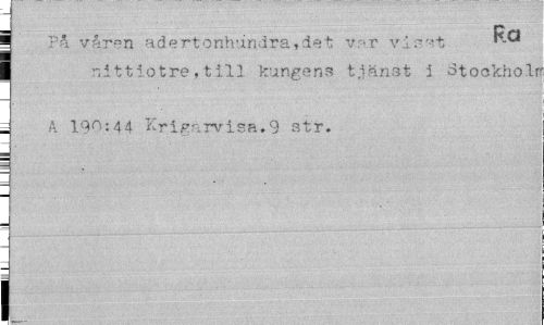 //// | På våren adertonh'indra»det var vinst 1 nittiotre,till kungens tjänst i dtookholr //// i A. 190:44 Krigårvisa»9 str. //// I ////