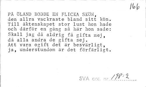 //// H //// PÅ ÖLAND BODDE EN FLICKA SKÖN, den allra vackraste bland sitt kön. Till äktenskapet stor lust hon hade och därför en gäng så här hon sade: Skall jag då aldrig få gifta mej, dä alla andra de gifta sej. Att vara ogift det är besvärligt, ja, understundom är det förfärligt. //// SVA ccc //^'.L., ////