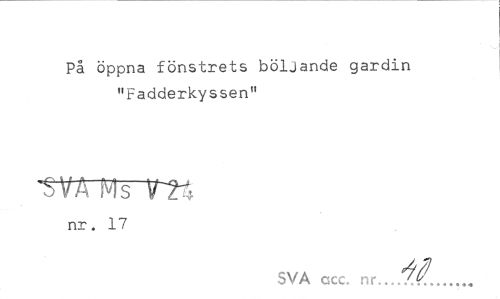 //// På öppna fönstrets böljande gardin "Fadderkyssen" //// 'SVA Ms m //// nr . 17 //// SVA ccc. nr. ////