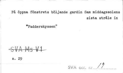 //// På öppna fönstrets böljande gardin Sam middagssolens //// sista stråle in //// "Fadderskyssen" //// -SVA Mg V4- //// s. 29 //// SVA acc. nr...//... ////