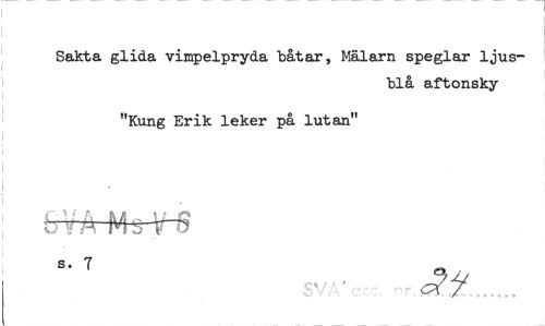 //// Sakta glida vimpelpryda båtar, Målarn speglar ljusblå aftonsky //// "Kung Erik leker på lutan" //// l VA Nte-fr-S //// S. 7 //// r <5^/ ////