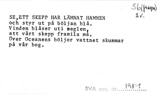 //// SE,ETT SKEPP HAR LÄMNAT HAMNEN //// och styr ut på böljan blå. //// Vinden blåser uti eeglen^ //// att vårt skepp framila ma. //// över Oceanens böljor vattnet skummar //// på vår bog. //// SVA ccc. nr.. J.^j.1... ////
