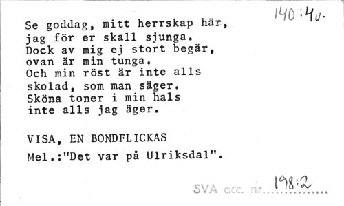 //// Se goddag, mitt herrskap här, jag för er skall sjunga. Dock av mig ej stort begär, ovan är min tunga. Och min röst är inte alls skolad, som man säger. Sköna toner i min hals inte alls jag äger. //// VISA, EN BONDFLICKAS Mel.:"Det var på Ulriksdal". //// SVA c r t^4*' ////