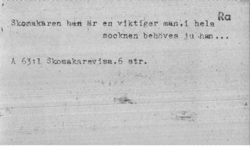 //// ka //// skomakaren han är en viktiger man»i hela //// socknen behöves iu -han... //// A 6311 Skomakarevisa.6 str. ////