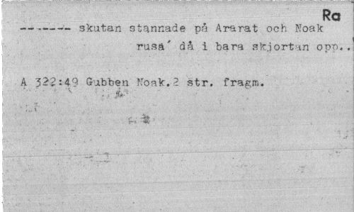 //// Ra //// --- skatan stannade på Ararat och Noak //// rusa' då i bara sk.iort m opp.. //// A 322:49 Gubben Noak.2 str. fragm. //// ' 'T- //// ¦ //// . ..¦..¦¦'.¦¦ . ¦ ... .. . i':, * '.'' ¦' ¦•¦''' ; ] : \ . '• ' " ////