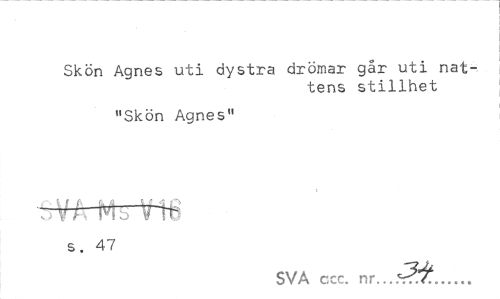 //// Skön Agnes uti dystra drömar går uti nattens stillhet //// "Skön Agnes" //// s. 47 //// SVA ccc. ... ////
