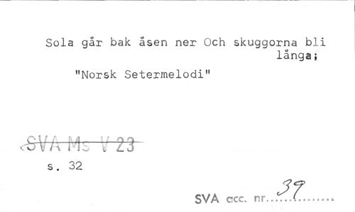 //// Sola går bak åsen ner Och skuggorna bli //// långa; //// "Norsk Setermelodi" //// <trV A V 23 //// s. 32 //// SVA ccc. nr...(... ////