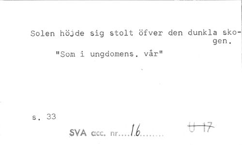 //// Solen höjde sig stolt öfver den dunkla skogen . //// "Som i ungdomens, vår" //// s. 33 //// SVA ccc. nr... /i. ////
