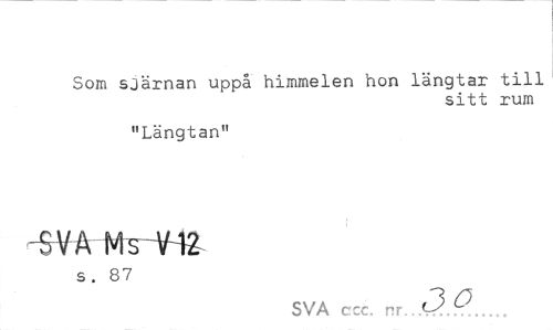 //// Som sjärnan uppå himmelen hon längtar till //// sitt rum //// "Längtan" //// -SVA MsiH2 //// s. 87 //// SVA ccc. nr ////