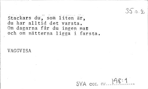 //// 36 a % //// Stackars du, som liten är, du har alltid det varsta. Om dagarna får du ingen mat och om nätterna ligga i farsta. //// VAGGVISA //// SVA ccc. nr.J^.l... ////