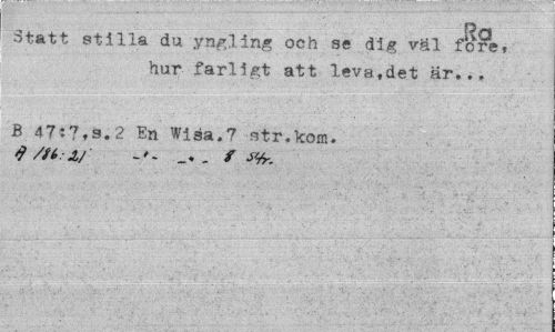 //// Ra //// Statt stilla du yngling och se dig väl före» hur farligt att leva,det är... //// B 47:7.3.2 En Wiäa.7 str.kom. 4/U l/ - * Wr- ////