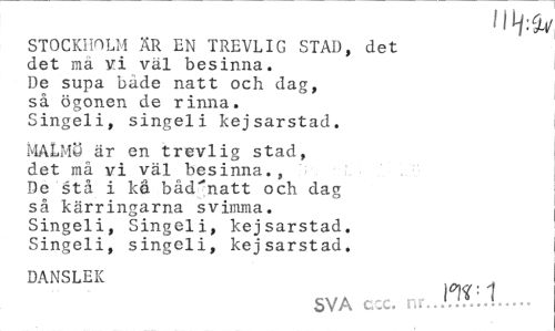 //// Mtyfr //// STOCKHOLM ÄR EN TREVLIG STAD, det det ma vi väl besinna. De supa både natt och dag, så ögonen de rinna. Singeli, singeli kejsarstad. //// MALMÖ är en trevlig stad, det må vi väl besinna., De stå i kå båd"natt och dag så kärringarna svimma. Singeli, Singeli, kejsarstad. Singeli, singeli, kejsarstad. //// DANSLEK //// SVA ccc. nr...'...'. •• ////