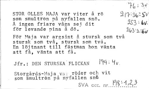 //// IL-^ //// STOR OLLES MAJA var vi ter å rö som smultron på nyfallen snö. . //// Å ingen friare våga sej dit Jo3 • bl/, //// för levande pina å dö. l^j i\ka //// För Maja var argsint å stursk som två stursk som två, stursk som två. En löjtnant till fästman hon vänta att få, vänta att få. //// Jfr.: DEN STURSKA FLICKAN //// Storgårds-Maja vax roder och vit som smultron på nyfallen sno //// SVA ccc. nr. ////