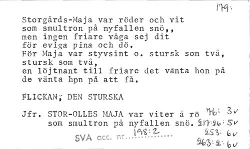 //// Storgårds-Maja var röder och vit som smultron på nyfallen snö,, men ingen friare våga sej dit för eviga pina och dö. //// För Maja var styvsint o. stursk som två, stursk som två, //// en löjtnant till friare det vänta hon på de vänta hpn på att få. //// FLICKAN,- DEN STURSKA //// Jfr. STOR-OLLES MAJA var viter å rö ^ //// som smultron på nyfallen snö. HM iif 5V //// SVA ccc. nr.JWZ— fi *** ^ ////