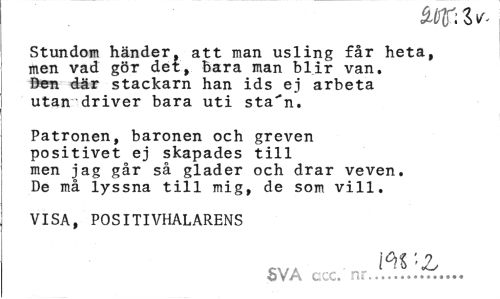 //// Stundom händer, att man usling får heta, men vad gör det, bara man blir van. Den där stackarn han ids ej arbeta utan driver bara uti sta"n. //// Patronen, baronen och greven positivet ej skapades till men jag går så gläder och drar veven. De må lyssna till mig, de som vill. //// VISA, POSITIVHALARENS //// I ^ ?' 2j //// SVA ,. ... ... ////