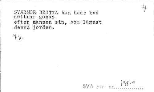 //// 1 //// SVÄRMOR BRITTA hon hade två döttrar gunås //// efter mannen sin, som lämnat denna jorden. //// T-v. //// SVA ccc. nr. ////