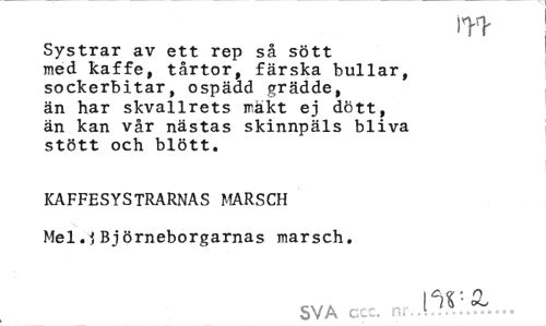 //// in //// Systrar av ett rep så sött med kaffe, tårtor, färska bullar, sockerbitar, ospädd grädde, än har skvallrets iräkt ej dött, än kan vår nästas skinnpäls bliva stött och blött. //// KAFFESYSTRARNAS MARSCH Mel.1 Björneborgarnas marsch. //// SVA ccc. nr l^'' ^ ////
