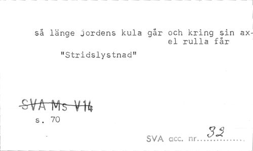 //// så länge jordens kula går och kring sin ax //// el rulla får //// "Stridslystnad" //// S. 70 //// <7 <0 //// SVA ccc. ////