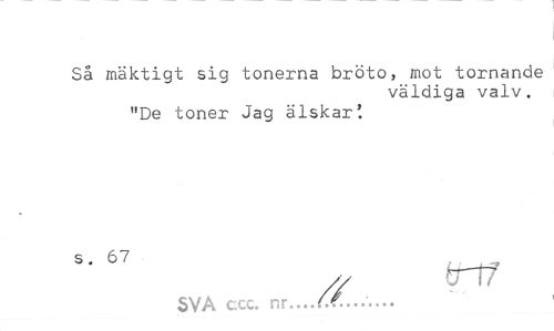 //// Så mäktigt sig tonerna bröto, mot tornande //// väldiga valv. //// "De toner Jag älskar'. //// s-67 H-tr //// // //// SVA ccc. nr.../f ... ////