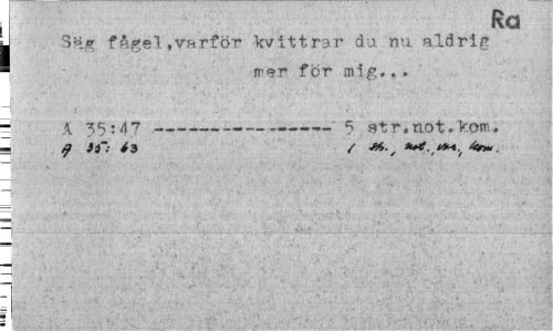 //// Ra //// | Säg fågel,varfÖr kvittrar du nu aldrig i mer for mig.,. //// J //// - x 47---5 str,not,kom. //// a # ii" / //// II 1;: //// ...i-i - - • :¦¦ / ; - ¦ .>.; .,, . Li //// —ii I hki^i^i^® fi^Mm^ msmattm H<m ////