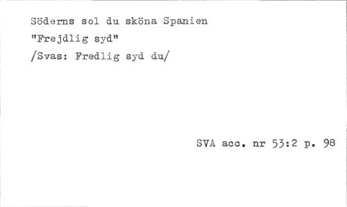 //// Söderns sol du sköna Spanien //// "Frejdlig syd" //// /Svas: Fredlig syd du/ //// SYÅ acc. nr 55:2 p. 98 ////