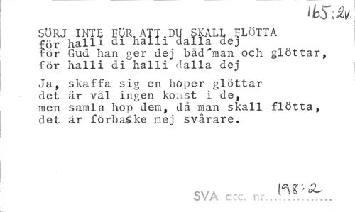 //// ib5 M //// SÖRJ I NT 5 EÖRtATT.DU SKALL FLÖTTA //// för halli Qi halli dalla dej //// för Gud han ger dej bäd'man och glöttar, //// för halli di halli dalla dej //// Ja, skaffa sig en hoper glöttar //// det är väl ingen konst i de, //// men samla hop dem, då man skall flotta, //// det är förbaske mej svårare. //// SVA ccc. nr . ////