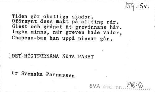//// Tiden gör obotliga skador. Oförsynt dess makt på allting rår. Glest och grånat ät grevinnans hår. Ingen minns, när greven hade vådor, Chapeau-bas han uppå pinnar går. //// ! det)högtförnäma äkta paret Ur Svenska Parnassen //// SVA ccc. ////