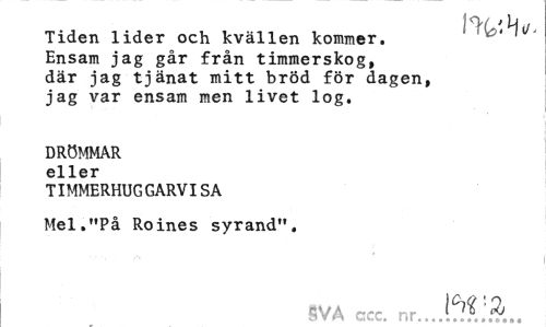 //// Tiden lider och kvällen kommer. Ensam jag går från timmerskog, där jag tjänat mitt bröd för dagen, jag var ensam men livet log, //// DRÖMMAR eller //// TIMMERHUGGARVISA Mel."På Roines syrand". //// SVA ccc. nr... 1^7? ////