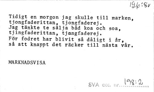 //// Tidigt en morgon jag skulle till marken, //// tjongfaderittan, tjongfaderej. //// Jag tänkte te sälja båd koa och soa, //// tjingfaderittan, tjnngfaderej. //// För fodret har blivit så dåligt i år, //// så att knappt det räcker till nästa vår. //// MARKNADSVISA //// SVA ccc. nr...-?.?...- ////