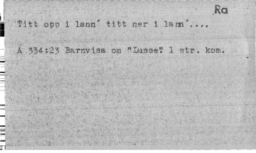 //// | Ra //// | Titt opp i lann' titt ner 1 lam'..,. A 334-:23 Barnvisa om "Lusse'.' 1 str. kom. //// i . ////